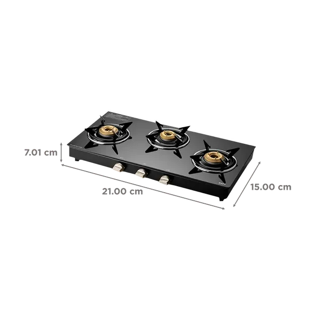 • Features- Type: Glasstop Gas Stove/ Cooktop, Size: 58 CM, Ignition Type: Manual Ignition, Glass Type: 8mm Thick Black Tempered Glass, Color: Black, Pan Support: Enamelled