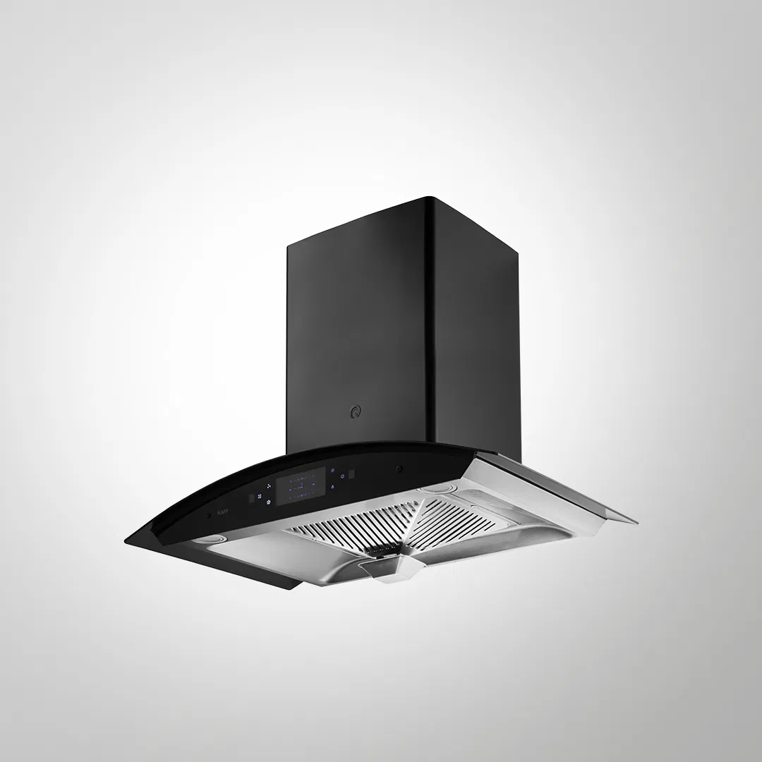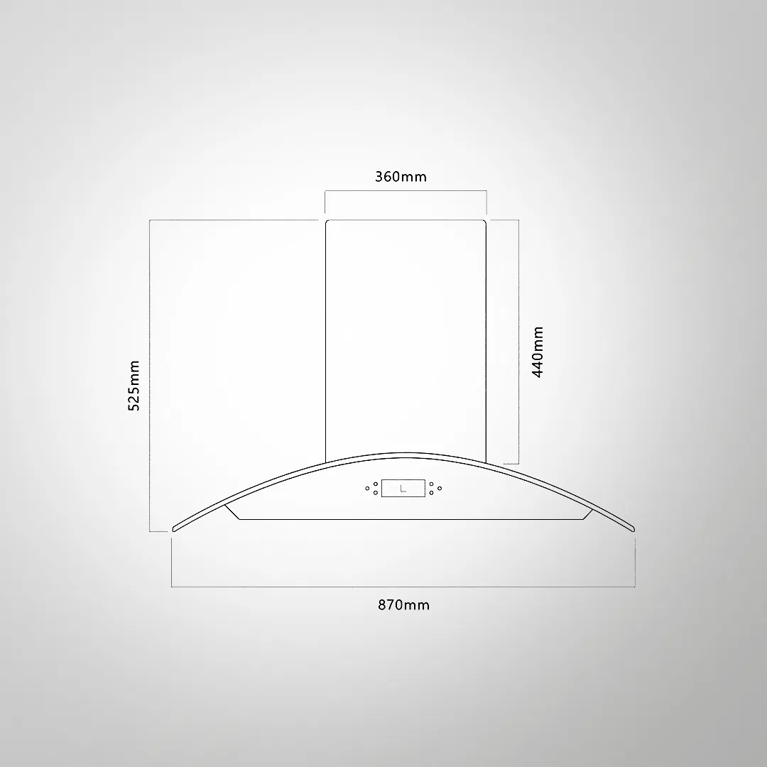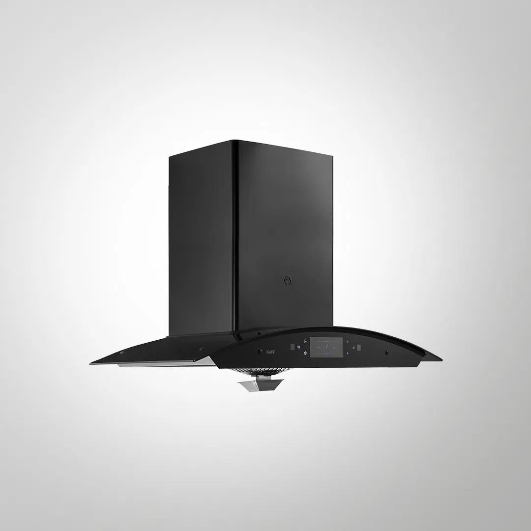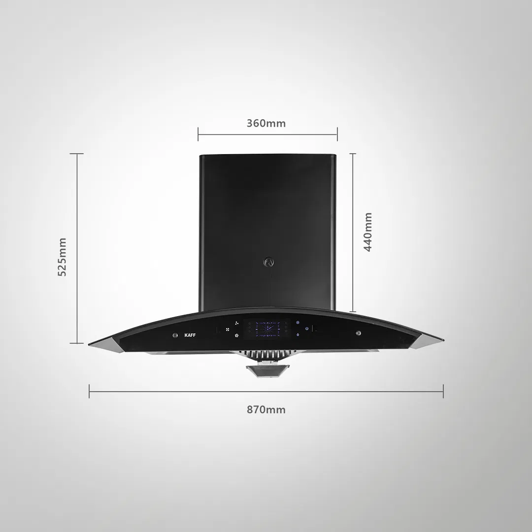 Filter-Less + Dry Heat Auto Clean Technology Front Black Glass with Black Steel Finish Black Curved Tempered Glass Thermostatic Touch Panel with Gesture Control Energy Saving Frosted LED Light Clock Display Multi-Dimensional Extraction System Stainless Steel Oil Collector Metal Blower and Metal Housing Designed Max Airflow (Up To): 1180 Nm3/h Noise Level : 62 dBA(max) Size: 90cm